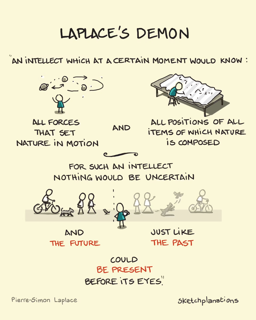 The debate about free will was transformed, or seemed to be, by quantum mechanics. Classical physics was deterministic: given the positions and velocities of all particles at one moment, the future state of the universe was in principle calculable. Laplace’s famous demon — an imaginary intelligence with complete knowledge of the universe’s state — could predict everything that would ever happen.
